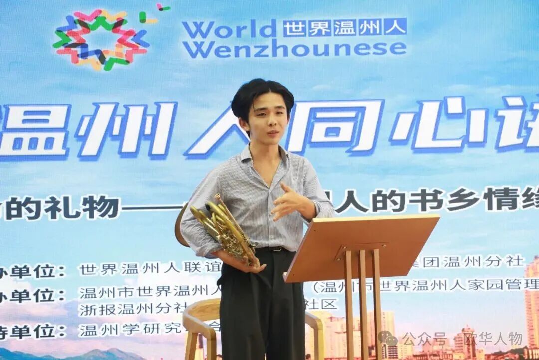 而活动现场最意外的“礼物”,来自遥远的亚平宁半岛。世界级圆号演奏家、意大利博洛尼亚音乐学院终身教授吉多·科尔蒂教授,在听闻朱锦绣的故事后深受触动,携团队来到现场。在温州大学意大利分校校长吴敏的介绍下,吉多·科尔蒂教授表达了他的敬意:“朱女士用书籍建造了一座抵抗遗忘的堡垒,而我用音乐传递情感。虽然形式不同,但我们对生命的热爱与赞美是相通的。”随后,吉多·科尔蒂的学生代广哲现场演绎,一段悠扬的圆号演奏响彻大厅,音乐与文字在此刻完美交融,完成了对“生命礼物”最动人的跨艺术诠释。