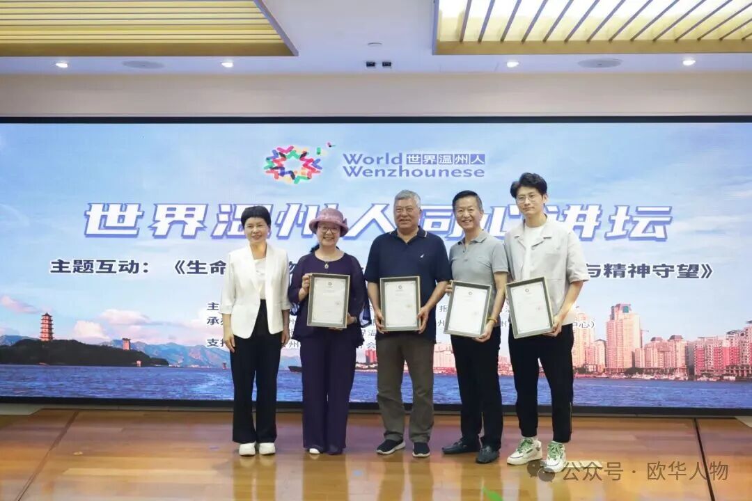 温州市委统战部副部长蔡仁燕(左一)为嘉宾颁发“世界温州人同心讲坛”主讲嘉宾荣誉证书