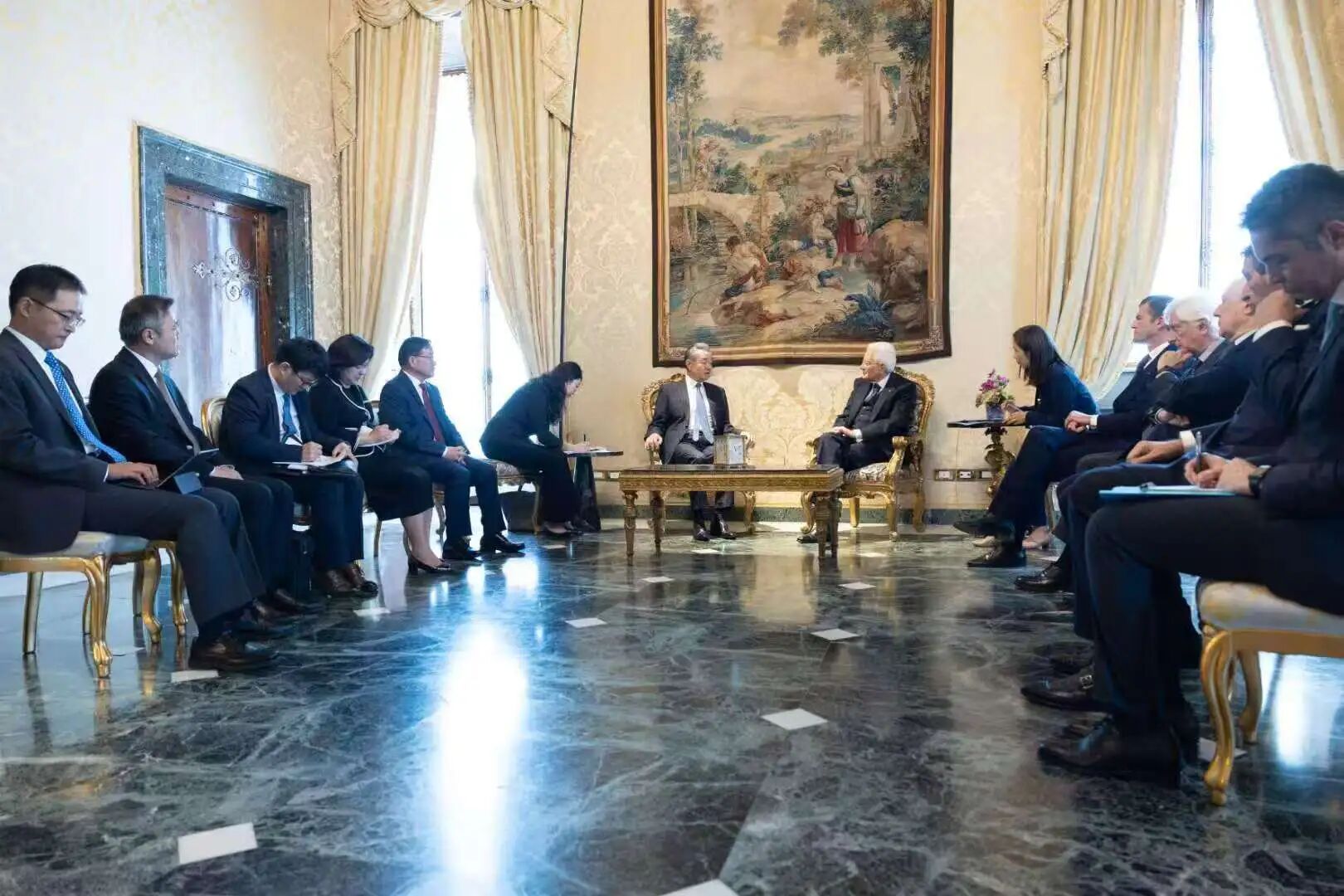 王毅转达习近平主席的亲切问候,表示总统先生是中国的好朋友,任内两度对华国事访问,体现发展中意关系的积极意愿和对中国人民友好情谊。中方也重视意大利在欧洲和世界上的影响,愿同意方一道落实两国领导人共识,加快推进中意全面战略伙伴关系行动计划,确保两国关系更加稳健、更具韧性、更富成果,不仅助力两国发展振兴,提高人民福祉,也为世界和平承担应尽责任。