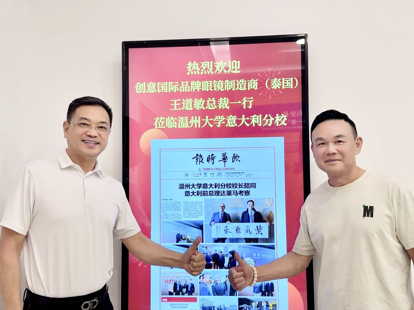 10月20日,创意国际品牌眼镜制造商(泰国)王道敏总裁一行莅临温大意大利分校、“一带一路”中国品牌世界行(“一带一路”丝路学院)考察指导,温州大学意大利分校校长吴敏陪同。