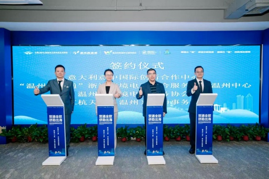 在各方领导的见证下,意大利意中国际创新合作中心主任刘力夫、浙江省跨境电商综合服务平台温州中心(温州跨境通)负责人胡珊珊、温州市跨境电子商务协会会长陈增开、浙江杭天信(温州)律师事务所执行主任陈云义律师共同签约,宣告温州首个国际化出海赋能平台——“中欧企业出海综合服务港”正式启动。该服务港将整合政府、平台、协会、法务与海外创新资源,聚合侨新代高层次人才新力量,为企业提供市场准入、法律咨询、物流清关、品牌落地等全链条服务。